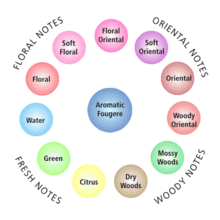 The four standard families are Floral, Oriental, Woody and Fresh. These are in turn divided into three sub-groups (e.g. in the Floral Family: Floral, Soft Floral, Floral Oriental) and arranged in a circle, each group being related to the next. Each of the subclasses were in turn divided into Fresh, Crisp, Classical, and Rich compositions. Prior to 2010 Fougère family was placed at the center of this wheel since they are a large family of scents that usually contain fragrance elements from each of the other four families; citrus from the fresh family, oak moss and woods from the woody family, coumarin and incense from the Oriental family, and lavender from the floral family.[5]