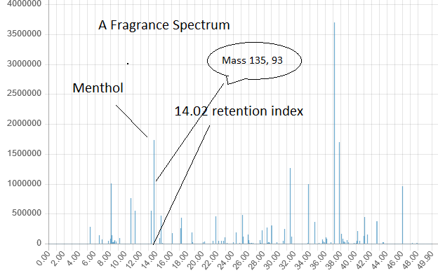 A fragrance spectrum is detailed list of what is contained in the fragrance as determined by GC/MS. Each sample is first separated by a retention index by the Gas Chromatograph. Then each individual compound is ionized and mass spectrum determined. After data collection, the data is analyzed by a sophisticated algorithm which is able to filter the spectrum for noise and correctly identify the signiture compounds in the fragrance.